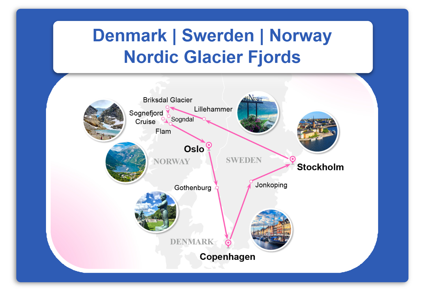 Visit Gothenburg, Jostedalsbreen, Oslo, Stockholm, Copenhagen (Amalienborg, Hans Christian Andersen Statue, The Little Mermaid), Gudvangen (Sognefjord Cruise), Flam.